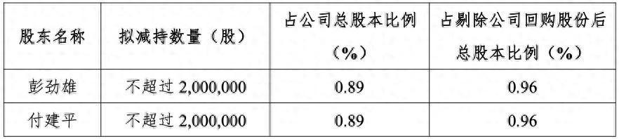 公告显示,持有公司股份17,320,185股(占公司总股本比例为7.71%,占剔除公司回购专用证券账户中的股份数量后总股本比例为8.32%)的公司董事兼高级管理人员彭劲雄计划以大宗交易或集中竞价的交易方式减持其持有的本公司股份,减持数量不超过200万股,约占公司总股本比例为0.89%,占剔除公司回购专用证券账户中的股份数量后总股本比例为0.96%。