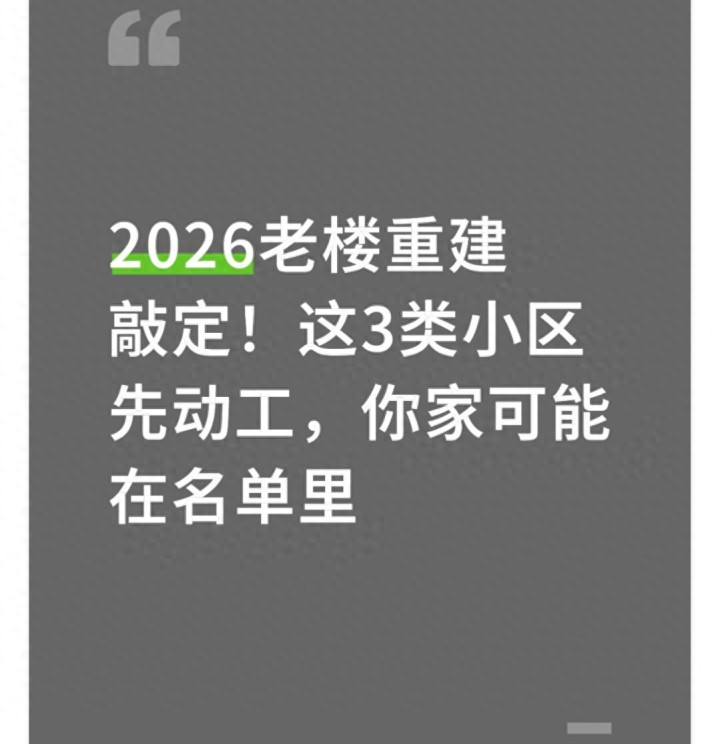 2026年的老楼重建,本质上是让老房子重新发挥价值,不是大拆大建,而是精准改善。那些住了二三十年的老破小,只要符合这三类条件,就能摇身一变成为配套全、安全性高的“新房”,这可比买远郊新房划算多了。